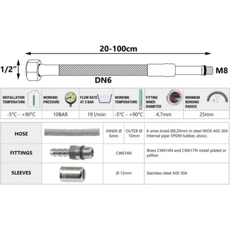– Internal non-toxic EPDM rubber braided of stainless steel.
