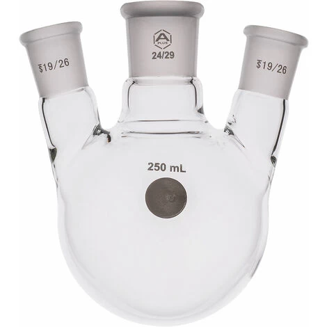 This round-bottomed flask from A PLUS has three necks, two of them angled, and is ideal for use in a variety of laboratory applications.
