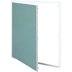 This access panel with aluminium frame allows for easy access to wall and ceiling inspection openings and cavities with gas, water and electricity meters or in-house fire plugs etc. Manufactured in large sizes, the inspection hatch with green plasterboard is also useful for space with quite large distribution stations such as central-heating distributors or ceiling storage. The revision door is equipped with spring latches, providing a surface without handles or grips to open the door. Just press at the longer edge of the part to be opened.