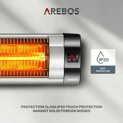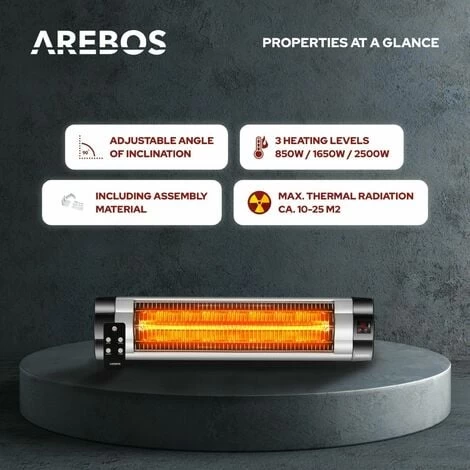 With a heating power of 2500 W this heater is very powerful. The infrared technology makes this radiant heater from AREBOS extremely efficient: Heat does not radiate into the ambient air but towards people in the nearby surrounding.