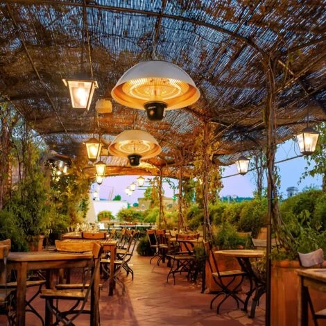 When the summer sun disappears from the horizon, another bright red heating source will stand by you: The AREBOS OVERHEAD radiant heater extends the cozy warm feeling of natural sunrays till late at night.
