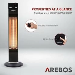 In addition to the 3 heat levels (650W/1350W / 2000W), the AREBOS patio heater has a 24 hour timer function, which you can conveniently operate via the control panel or the remote control.
