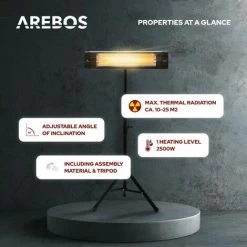 [Adjustable tilting angle & tripod] The tilting angle of this AREBOS heater can be adjusted to up to 90° for the heat to reach any area as desired. The included tripod can be adjusted in height to between 115 and 175 cm.
