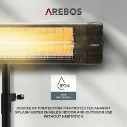 [Suitable for indoors & outdoors] In order to use this patio heater in a safe way, it has been designed in conformity with protection degree IP34. It is therefore protected against dust, splash water and jet water, making it suitable for both indoor and outdoor use.