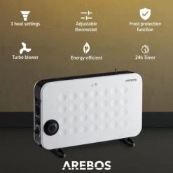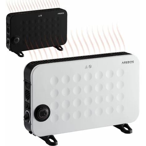 Whether as an effective supplementary heater or for seldom-used, unheated rooms – with the energy-saving convector heater from AREBOS you can enjoy cosy instant heat in autumn, winter and even on cool spring days. With a heating power of 2000 watts, the convector provides pleasant comfortable temperatures in rooms up to 24 m² or 60 m³ – ideal e.g. in the living room, bedroom, bathroom, children’s room, hobby cellar, office, party room, in the holiday flat, in sales rooms or in your conservatory.