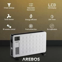 Whether as an effective supplementary heater or for rarely used, unheated rooms – with the energy-saving convector heater from AREBOS you can enjoy cosy instant heat in autumn, winter and even on cool spring days. With a heating power of 2300 watts, the convector provides pleasant comfortable temperatures in rooms up to 27 m² or 67 m³ – ideal e.g. in the living room, bedroom, bathroom, children’s room, hobby cellar, office, party room, in the holiday flat, in sales rooms or in your conservatory.
