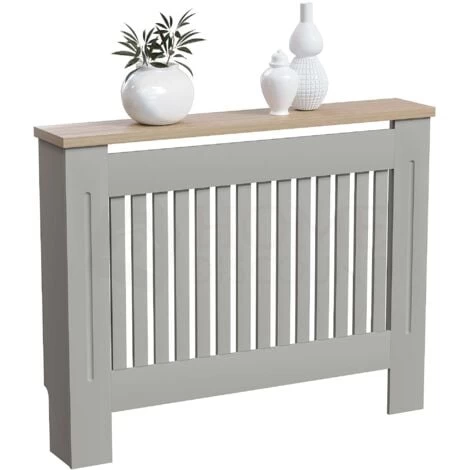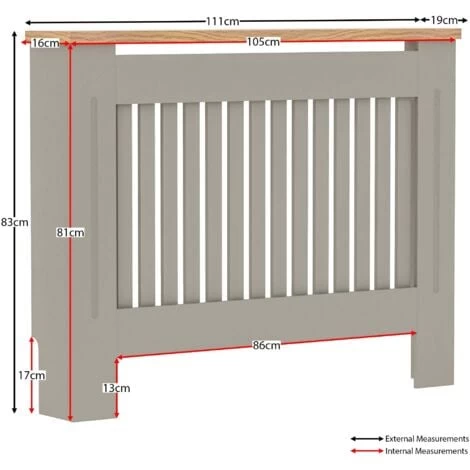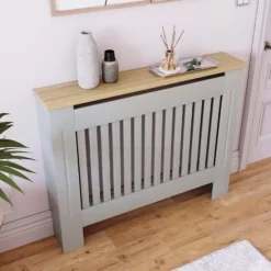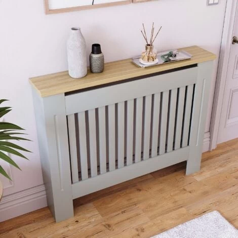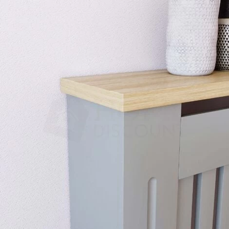 Home Discount offers this stunning handy living room gem, the Arlington Radiator Cover, Grey. Versatile and space-saving radiator cover has been finished with neutral paint and melamine oak effect veneer top board. It offers not only visually appealing addition to any room, but also it acts like an extra shelf for some of your accessories, decorative elements, and plants. Featuring vertical line pattern, it has a perfect combination of design and ventilation construction which means you do not lose any heat and uplift room interior.