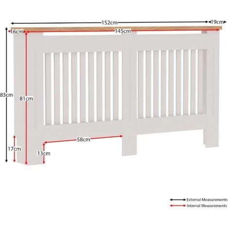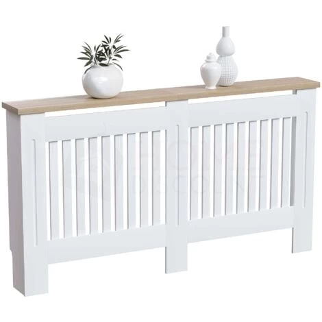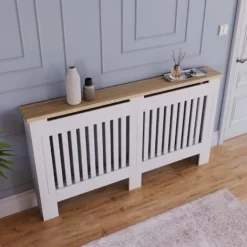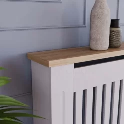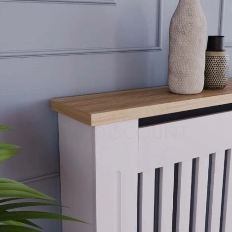 Home Discount offers this stunning handy living room gem, the Arlington Radiator Cover, White. Versatile and space-saving radiator cover has been finished with neutral paint and melamine oak effect veneer top board. It offers not only visually appealing addition to any room, but also it acts like an extra shelf for some of your accessories, decorative elements, and plants. Featuring vertical line pattern, it has a perfect combination of design and ventilation construction which means you do not lose any heat and uplift room interior.
