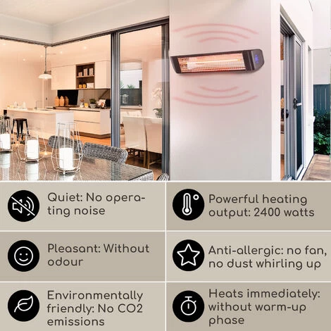 The light blumfeldt Smartwave radiant heater can be easily mounted on the wall and is therefore not in the way while it warms you quickly and efficiently from above with 2400 watts. The infrared technology specifically releases the heat to the people in the vicinity of the radiant heater and not to the surrounding air. With a practical remote control, you can set the digital thermostat to 5 to 45 ° C in a matter of seconds, making it very easy to meet your specific needs, such as frost protection in winter or a pleasant source of heat on cool evenings. Plan your dinner, garden party or garage party without worrying about the temperatures, because with a click of the toggle switch you can generate a pleasant, cosy warmth without a long warm-up phase. The lighting effect of the carbon fiber infrared tube is reduced to a minimum so that you can enjoy the evening without glare. The integrated body sensor, which switches the radiant heater on when people are in the detection area and switches it off when they have left it, is particularly practical.