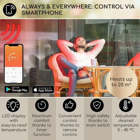 The blumfeldt Smartwave infrared heater is truly smart, however, thanks to its app control option. Regardless of whether you have an Android or IOS device, simply download the ‘blumfeldt’ app and use Multicommand to easily connect and control up to 7 devices via WiFi at the same time. This makes the Smartwave a smart and space-saving replacement for extensive heating elements – especially well suited for street cafes or beer gardens, but also practical in workshops and large work areas. OpenWindow Detection avoids unnecessary heating costs by recognising open windows and switching off the radiant heater.