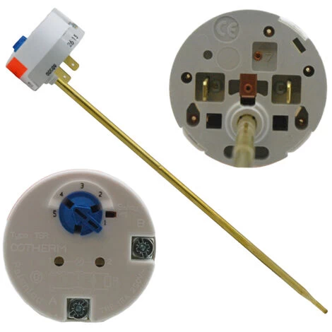 Dual Function Rod / Stem Thermostat with adjustable trip and safety cut-out. Functional switching is achieved via single pole stem control and safety cut-off is via a double pole bimetallic safety limiter. The Cotherm TSR00009 thermostat is CE marked and approved to EN 60730.