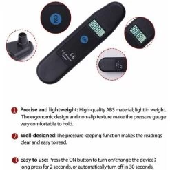 Precise and lightweight: 4 units; RANGE: 0-100PI, 0-7Bar, 0-700kpa, 0-7kgf/cm²; High quality ABS material; Light. Ergonomic design and non-slip texture make the pressure gauge very comfortable to hold.