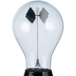 This Eisco Crookes radiometer is an educational science tool which is made of a glass bulb containing a partial vacuum. It’s approximately 70mm in diameter, containing a fine spindle which supports four light weight vanes. One side of each vane is darkened, and the reverse side is light.