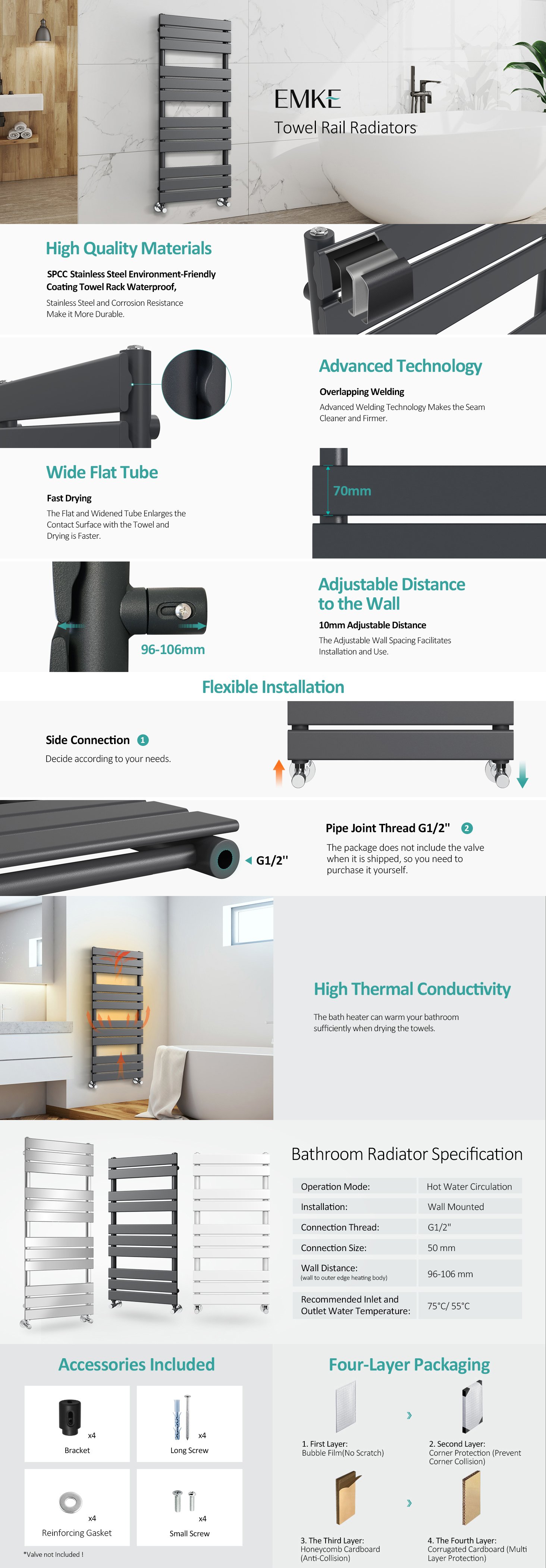 EMKE is committed to producing modern, aesthetically pleasing and thermally efficient radiators in order to make more homes experience warmth and comfort in their bathrooms. Different sizes and colours and styles make it easy to choose the most suitable towel radiator for your purchase.