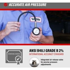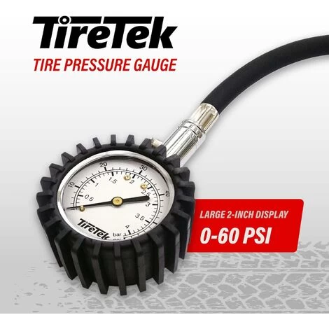 Calibrated to international accuracy ANSI B40.1 degree B (±2%), with built-in bleed button for precise tire pressure adjustments.Easy to use with extended tip and 360° rotating device to allow reading from all angles. Perfect for all cars and motorcycles.Sturdy steel construction with reinforced rubber hose and extended brass fittings inside to prevent air loss. This measuring device is particularly durable. Save fuel and provide safety for your family. A great gift for any dad. Reliable 0-60 PSI mechanical pressure gauge, battery-free, works in all weathers and won’t let you down. Why buy the TireTek TT-GH01-QBR2-E Professional Pressure Gauge? -60 PSI – perfect for all cars and motorbikes. 5cm large contrast graduated dial – clearer and more precise display. Hydraulic 360° rotating device, the dial is readable from all angles. Rubber flexible hose, no air loss, durable. With protective tire-style cover, which protects the meter from drops and bumps.Built-in bleed button for precise adjustments when deflating the tire.Reliable and accurate mechanical measuring device, lasts for years (without batteries).  Why choose TireTek?TireTek is a quality brand of automotive accessories and specializes in mechanical and calibrated pressure gauges and pressure gauges. 100% Certified to ANSI B40.1 Grade B Calibration Standard; suitable for all passenger vehicles, cars, 4x4s, motorcycles or bicycles.  Benefits of the TireTek Flexi-Pro Pressure Gauge: Save money on tires – by avoiding too low or too high pressures, and therefore tire wear. Save fuel – constant tire pressure provides even more savings. Improved handling – regular tire checks ensure optimum driving performance. Guaranteed passenger safety – too low air pressure is the main cause of tire damage.  Included: TireTek Service Manual (in English, French not guaranteed).