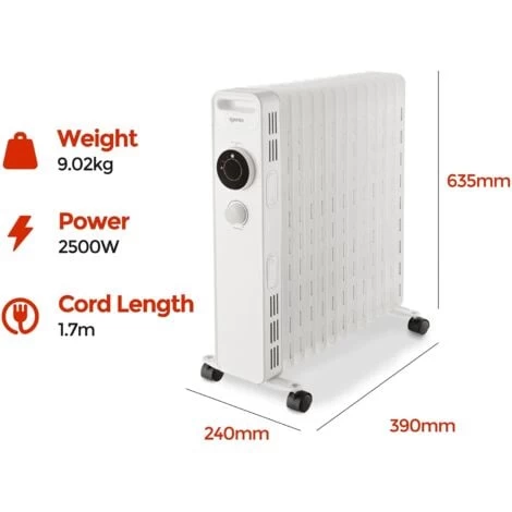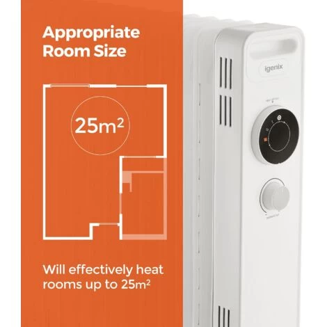 The Igenix IG2625 is an oil filled radiator with 2500W of power so you can keep out the cold this winter with instant heat. Save on central heating by using a portable oil filled radiator to warm up a room in a matter of minutes. The radiator has a host of features such as a Dial Control Panel and Remote Control to easily adjust the heat, Rolling Castors for easy manoeuvrability around your home and Heat Resistant Housing to make it safe for children and pets. Adjust the radiator to make your room the perfect temperature with 3 adjustable heat settings. To make sure you can operate the radiator safely it has Overheat Protection and a Tip Over Switch that will stop it overheating and automatically cut off if tipped over so you can switch on the radiator and leave it in the room to heat up without worrying.