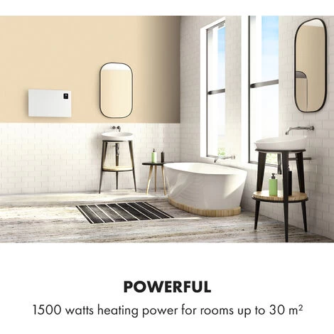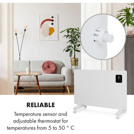 With 1500 watts of power, the Klarstein Bansin Smart 1500 heater provides warmth in rooms up to 30 m². An integrated thermostat, in conjunction with the room temperature sensor, enables temperatures from 5 to 50 ° C. Timers and weekly timers ensure operation to the minute and switch the convector on and off according to the settings made. The panel made of glass and metal is splash-proof with IP24, so the Klarstein Bansin Smart 1500 is therefore also suitable for use in the kitchen and bathroom. Use of the device is also flexible: fixed installation on the wall is possible, as is operation as a mobile stand-alone device with floor rollers.