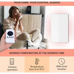 With a thermostat and sophisticated functions such as the auto switch-off function and the OpenWindow Detection, the infrared heater meets even the most demanding requirements. An adjustable weekly timer enables the programming of heating times for each day of the week. Without a fan, no dust is stirred up & this makes the heater the ideal choice for allergy sufferers, it also works quietly and is also very suitable for the bathroom.