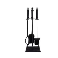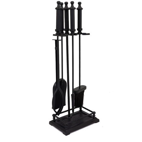 This 4 piece companion set has iron frames with aluminum handles. It features a pair of tongs, a brush made from natural coco fibers, a poker and coal shovel. Its rectangular base features a perimeter surround, holding any fallen ash or debris within its bounds. The traditional design and the black matte finish make this companion set a must for those cold nights by the fireside.