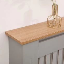Our medium radiator cover is featured in grey. With a stylish oak top, the flat surface can be used to place items on or to just neaten your room. The slatted grill design looks elegant and will suit any style of home. This is the perfect item to cover a radiator that is not too big. The cover is visually pleasing and will hide a metal radiator but still give out the appropriate heat.