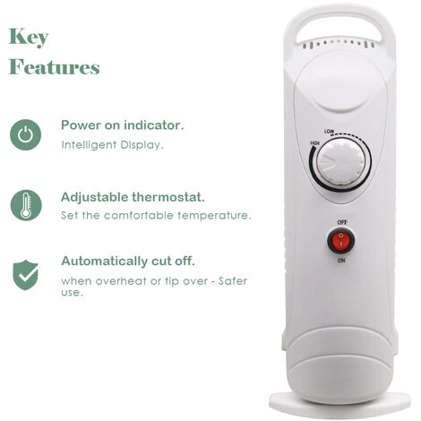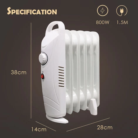 – 800W mini lightweight oil filled radiator with 6 fins, perfect for adding some extra warmth to your home.