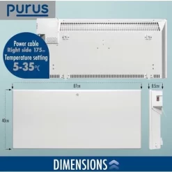The Purus 1800W Free Standing Wall Mountable Electric Panel Heater Product Size – L 87cm x D 7cm x H 40cm Approx.