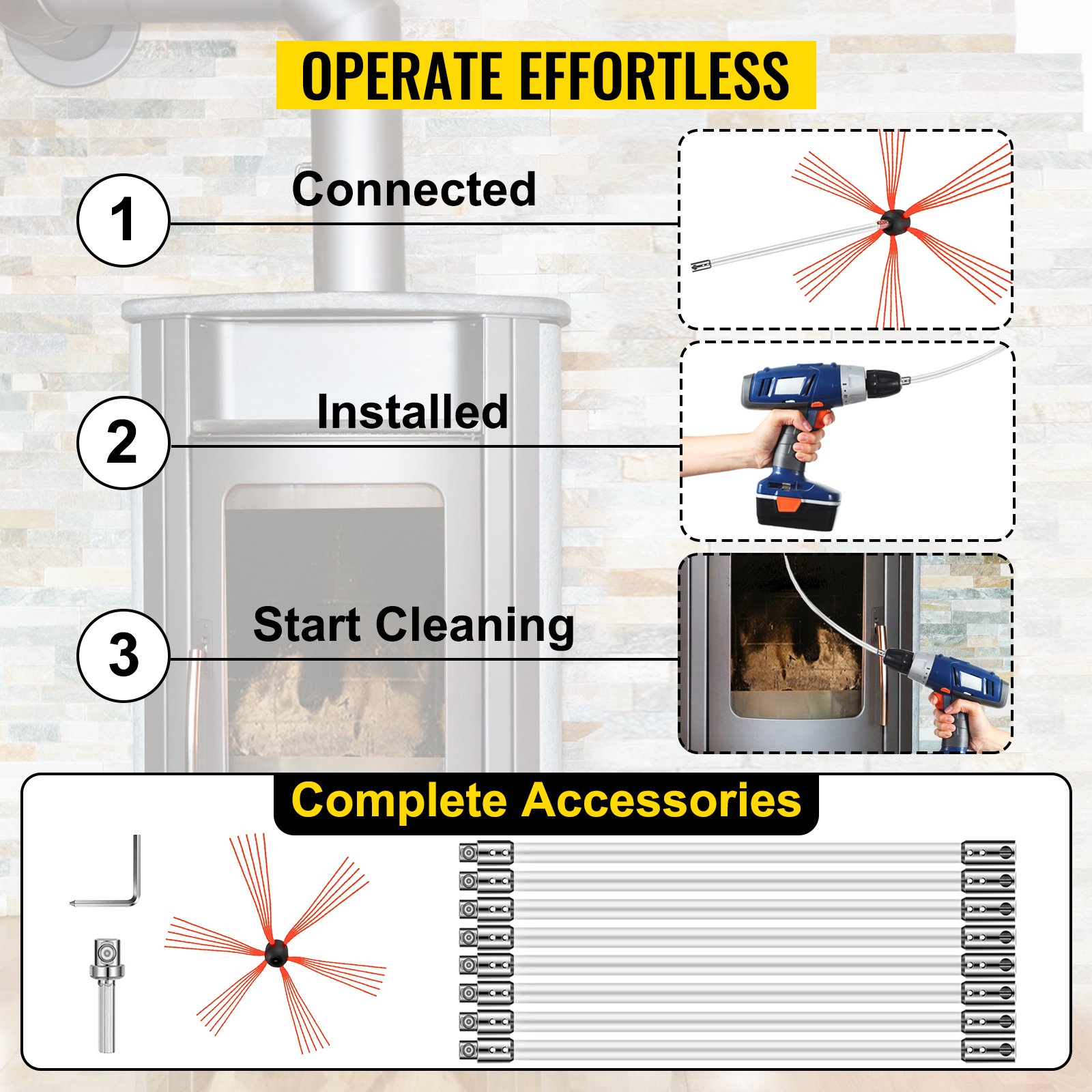 Complete accessories included, this chimney brush kit operates without effort. First, connect the rod and head. Then, put the brush into the flue, and install the rod on the drill. Finally, start cleaning the chimney with the drill in no time.