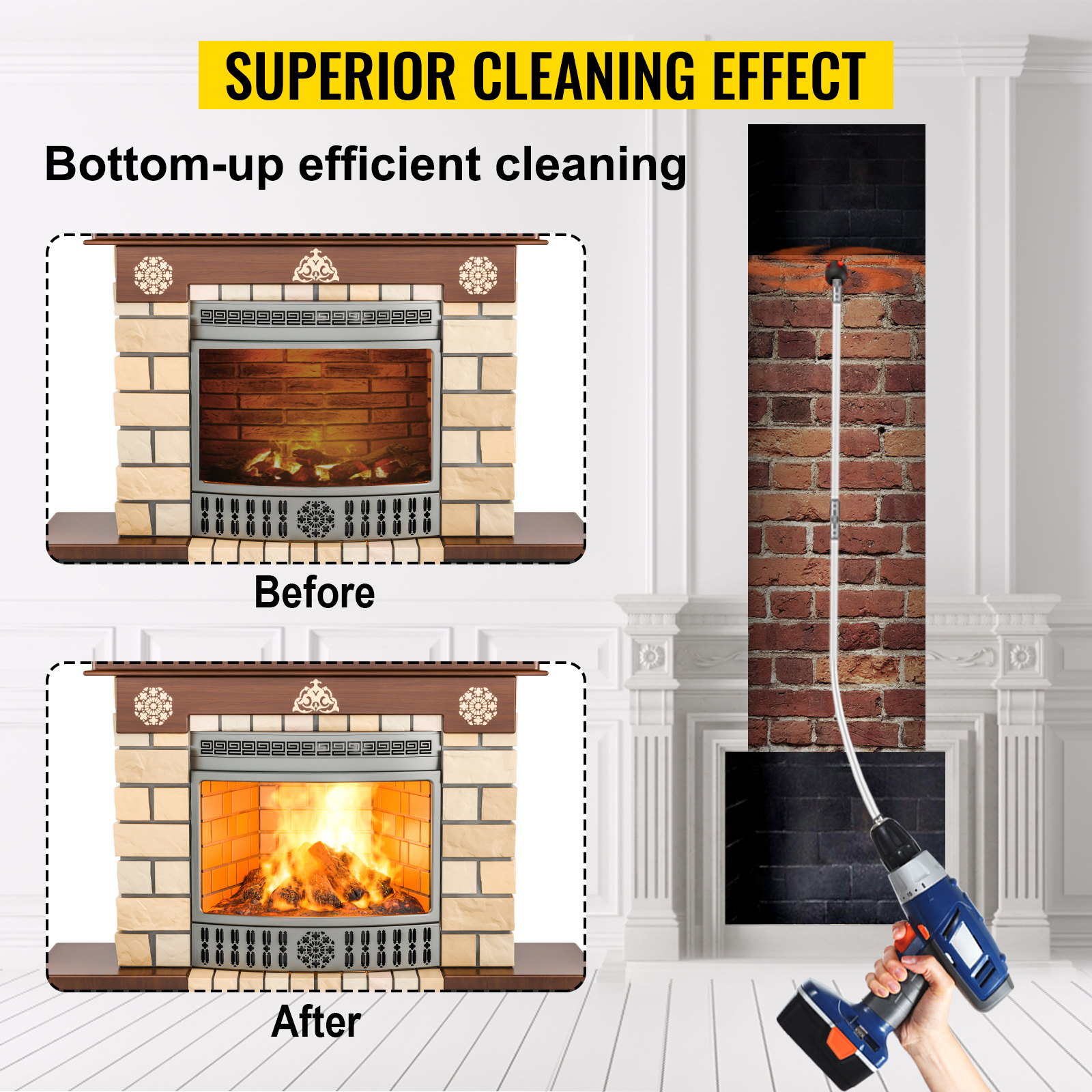It can be connected to a power drill, effectively sweep away soot. The chimney brush rods are easy to operate. You can do it yourself. No ladders needed, safely clean from the bottom up.